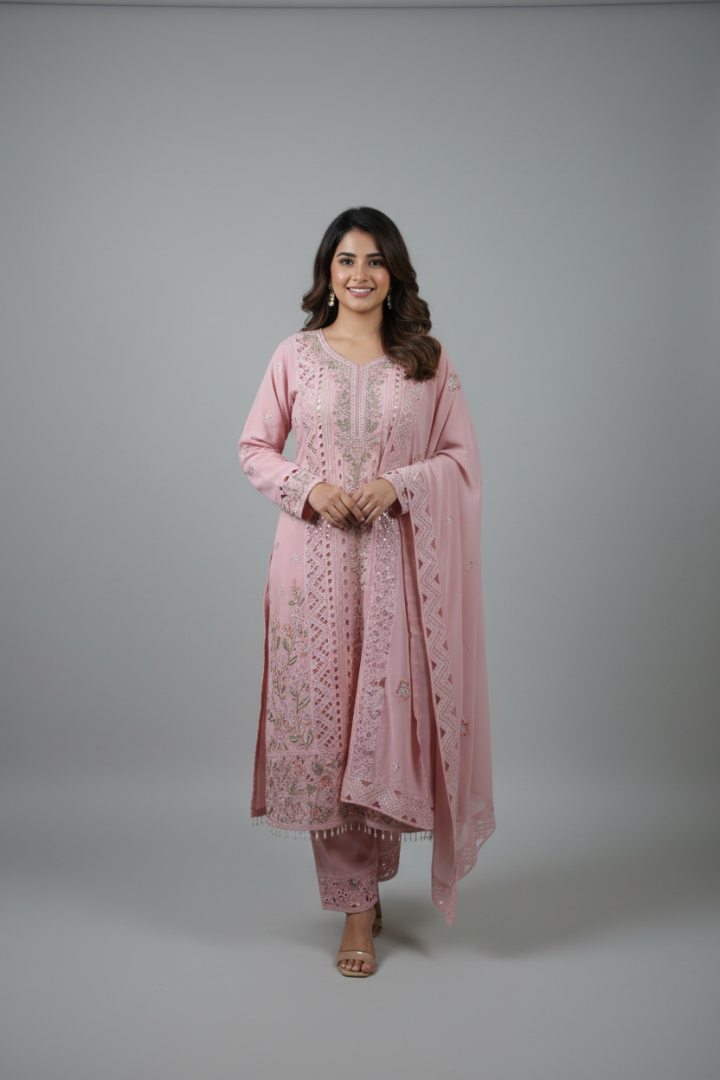 Crafted in Pure Chiffon fabric, this ready-made ensemble reflects HAYA’s signature balance of comfort, modesty, and timeless design. The delicate embroidery and graceful silhouette make it a versatile choice — perfect for festive gatherings, elegant daywear, and intimate occasions. Designed for women who appreciate understated beauty, this piece offers a premium feel without excess, allowing the craftsmanship and fabric to speak for itself.